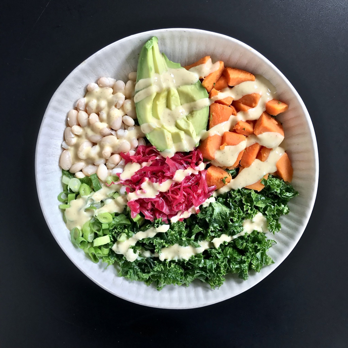 - Place kale on the bottom of the bowl. Add white beans, cooked sweet potato (cooled or warm), green onion, avocado and kraut.
