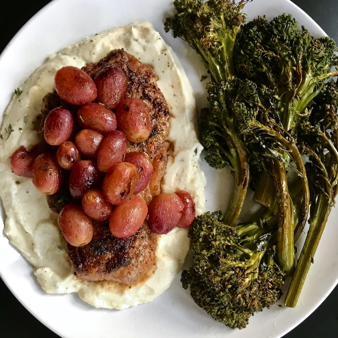 - Serve pork over warmed goat cheese and thyme mashed cauliflower and top with roasted grapes.
