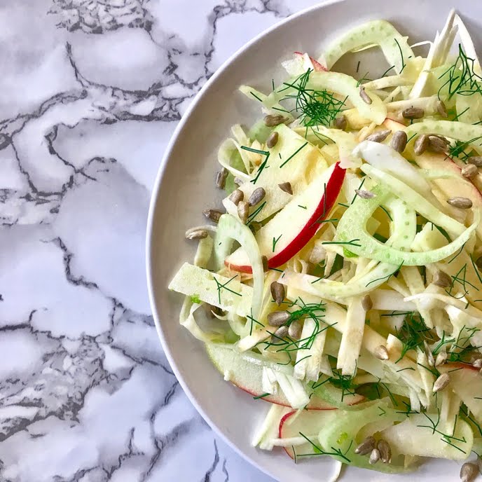 This celery root, fennel, and apple salad with Manchego cheese and sunflower seeds is tossed with a slightly sweet, tangy dressing made with lemon juice, apple cider vinegar, honey, salt, and extra virgin olive oil. It is a simple side or light meal that epitomizes how a handful of ingredients, in their natural state, can combine to be more than the sum of its parts.
