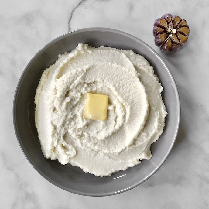 - By the time the cauli is done steaming, the garlic should be cool enough to handle. Squeeze the roasted garlic cloves from the bottom to release them. Place into a food processor along with the steamed cauliflower, butter, sour cream, and shredded asiago cheese. Process until completely smooth, scraping down sides as needed.