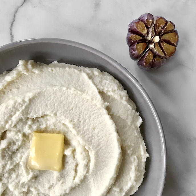 Cauliflower mash is one of my favorite sides because it reminds me so much of mashed potatoes but with a lighter texture due to virtually no starch. Plus, the whipping action of the food processor gives it some airiness. That said, using roasted garlic, butter, and some sour cream gives all the flavor you find in a well seasoned mashed potato. For me, I feel better after eating this because it is lighter and easier on the digestive system. My secret to making a cauliflower mash with a nice mash texture (versus a puree) is steaming. When you steam it until just fork tender, the flavor stays more neutral than roasting the cauliflower (like potato) but it avoids becoming water logged, and thus mushier, when boiled. This my friends is the secret – steam until just fork tender and it has enough body to process into a dense puree, like super velvety mashed potatoes but just a smidge lighter. Ain’t nothing bad to say about it!