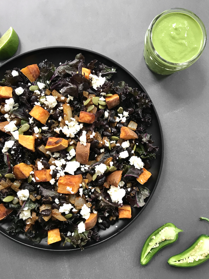 Chipotle Black Bean, Sweet Potato, and Kale Salad with Cilantro Pepita Sauce