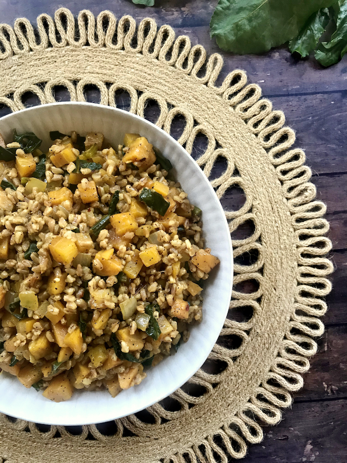 - Add farro to the beets and greens. Stir to distribute everything. Taste and add salt. Place into serving bowls or plates.