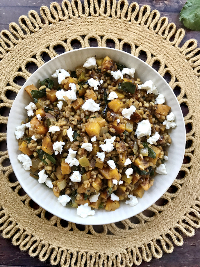 Farro with Roasted Beets, Sautéed Beet Greens, Balsamic, and Goat Cheese