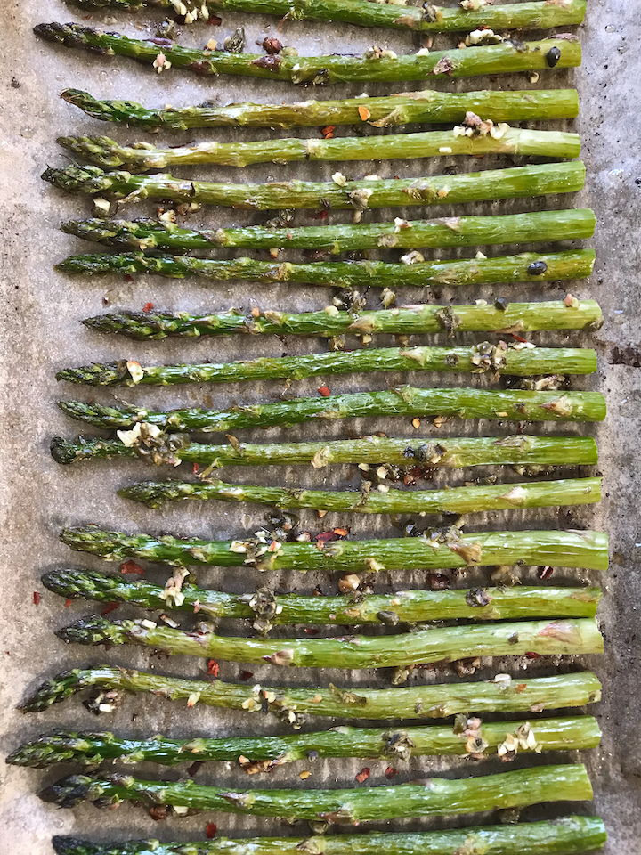 - Chop the woody ends off of the asparagus and place them on a sheet pan. Toss in some oil (about 2 tsp.) and sprinkle on some salt. Keep in mind the capers and anchovy are salty, so you only need a pinch.
