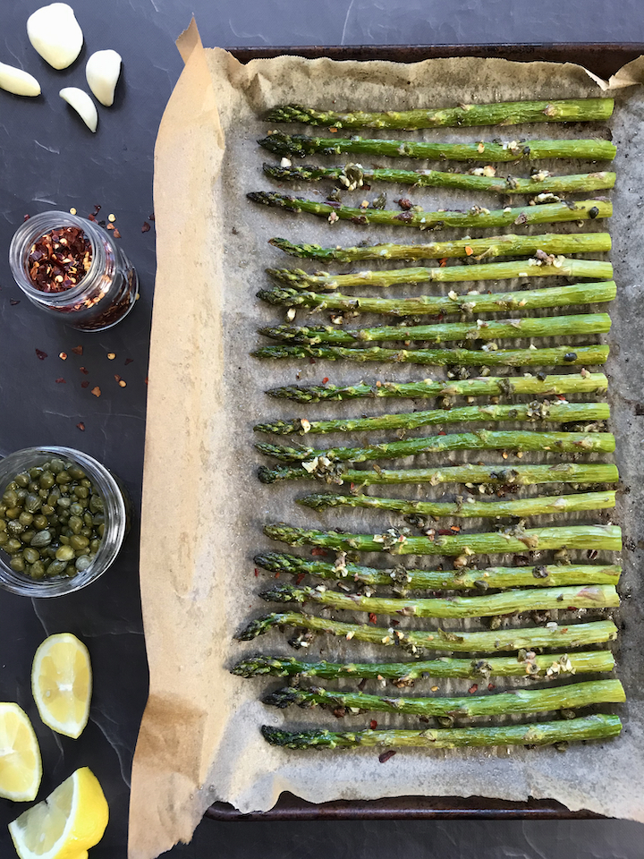 Asparagus can hold its own when paired with bold flavors just like the capers, anchovy, and garlic in this easy, punchy side dish. Salty capers and umami packed anchovies are a match made in heaven – just ask puttanesca sauce. Add in some savory garlic (which turns golden brown when roasted at high heat, mellowing the sharp bite) as well as bright lemon juice for some acid and you got flavor for days. This asparagus is so mouthwateringly tasty I have literally eaten a whole pan-full straight from the oven and I am not even mad about it!