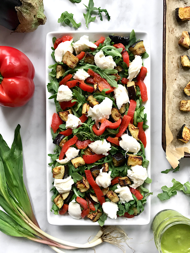 - Assemble the salad while the eggplant is cooling. Arrange a bed of arugula and layer the roasted red bell pepper, roasted eggplant, and torn mozzarella on top. Serve with ramp vinaigrette.