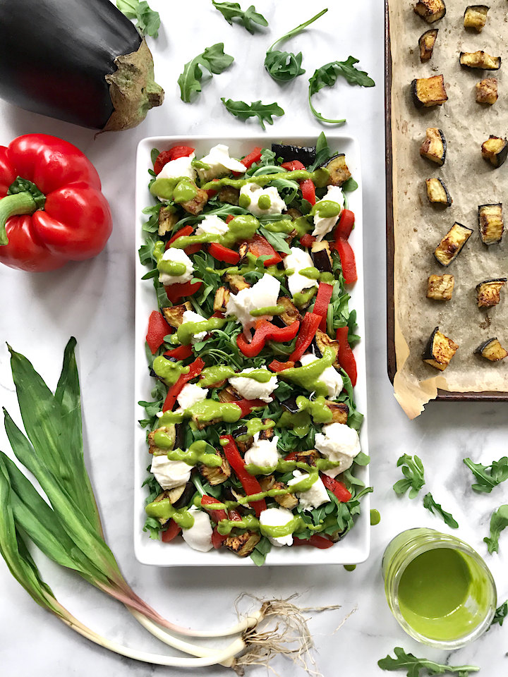 Okay so ramp vinaigrette aside, this salad has a lot of tasty things going for it. The roasted red pepper has sweet but vegetal qualities and you can use homemade or the canned variety. Roasted eggplant gets crispy on the outside and as tender as a dream on the inside. I love how it kind of acts like the bread in a panzanella salad here, with the large-ish chunks that soften and absorb some of the dressing as you eat it. Plus it has such a nice smokey, mildly bitter, but delicately sweet flavor that just marries so well with the roasted red peppers. Arugula is a spring-time all star just like the ramps so there was no hesitation to use it as the green. Flavor-wise, it brings peppery notes that act as a nice anchor for all the sweet bits. Creamy and soft fresh mozzarella adds saltiness and subtle tang. The ramp vinaigrette envelopes everything in tons of flavor! It is bold, garlicky, sweet, acidic, salty, it has all the notes that the salad is just begging for.