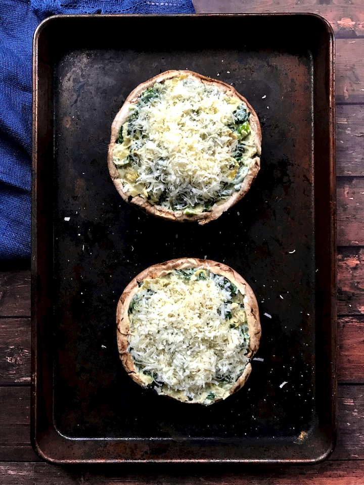 I find these are best right from the oven because the filling is soft and you want to maintain that crisp texture of the parm on top. You can prep them but keep in mind the mushroom will not have the same bite and the filling gets a bit mushier. If you do prep them, the best move is to not top with the parm until you reheat them in a hot oven to get that same texture. Anyway you do it, these goat cheese spinach and artichoke stuffed portobellos are pure comfort and sure to please.