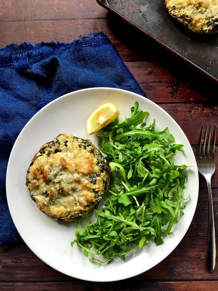 For as tasty as these bad boys are they are very straight forward to make. Because spinach cooks so quick, the filling takes less than 10 minutes to make and the shrooms cook for just about 15-20 minutes. Using a high heat to cook the stuffed portobellos allows the parmesan cheese topping to crisp up and brown because crispy cheese is where flavor lives.