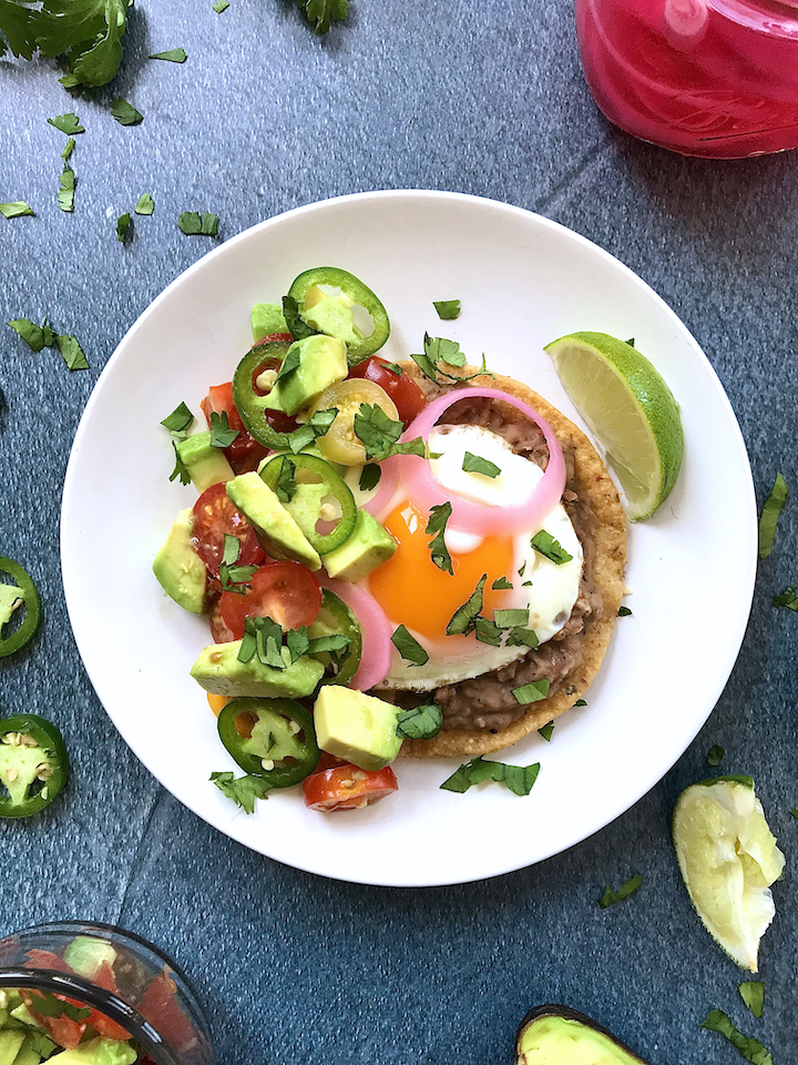 A crispy, freshly fried tortilla is topped with creamy ‘refried’ beans, a runny egg, pickled onions and a chunky tomato-avocado salsa in these best ever breakfast tostadas.