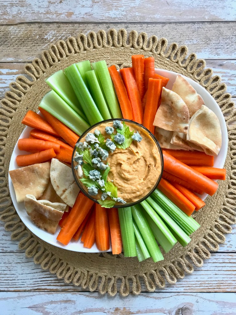 Speaking of, if you have ever made hummus you know the struggle that is peeling all the chickpeas. While it is easy enough, it is time-consuming and there is no quick way around it if you want the silkiest, smoothest of hummuses. Enter the humble white bean – these guys can be blended down into a hummus-like dip without any of that peeling effort! The flavor is more neutral so it lets the buffalo and blue cheese take center stage.