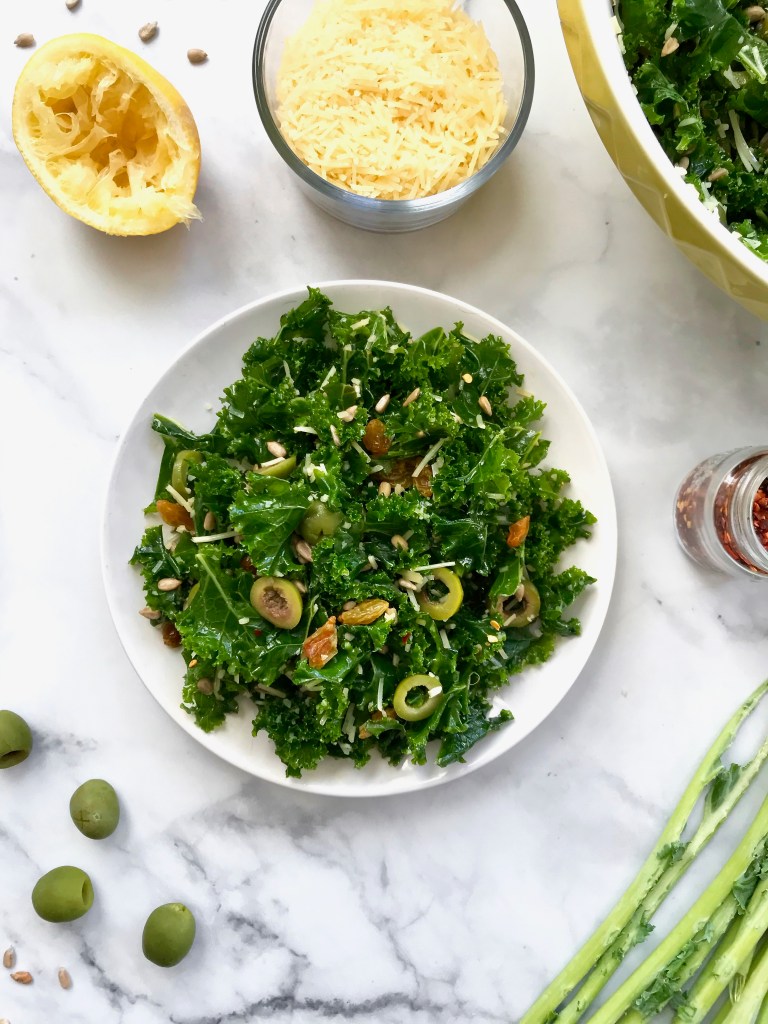 Lemony Kale Salad with Olives, Golden Raisins, Parmesan, and Sunflower Seeds