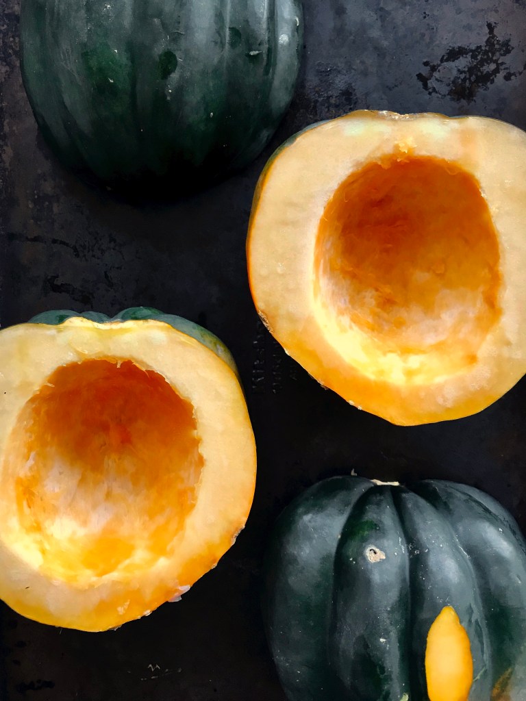 Then each half is lovingly coated with a bit of oil and generously salted before being roasted, cut side down, in the oven until it becomes soft and is starting to caramelize. While the squash roasts, the filling is prepared.