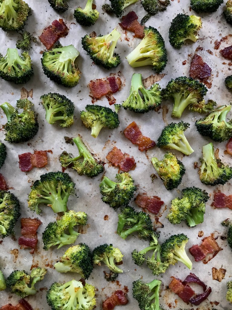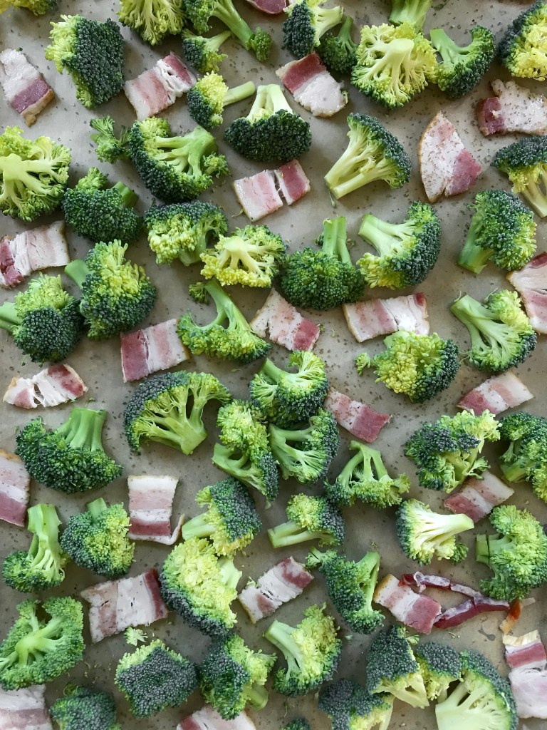 - Line a large sheet pan (or two smaller ones) with parchment paper (see note). Spread broccoli florets out on the sheet pan. Cut the bacon into 1/3-1/2 inch slices and place them on the sheet pan, dispersed evenly around the broccoli. Sprinkle on some s&p.