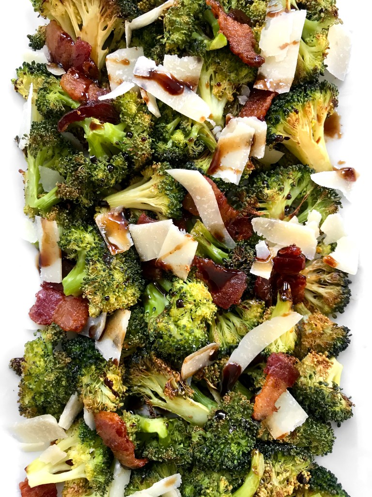 In this recipe, broccoli is roasted on a sheet pan with bacon, infusing it with tons of bacony-goodness. The crispy roasted broccoli and bacon are then topped with a thick, sweet, balsamic glaze and umami-packed shaved parmesan cheese for the most delicious side dish, appetizer, or small plate.