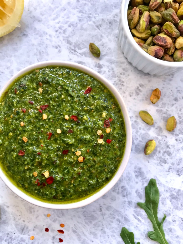 The ratio of basil to arugula in this recipe is 3:1. TBH, the arugula and basil combo came about because pesto uses a lot of basil, and basil is not always the most affordable thing. I was so pleased to discover that the blend of the two + the pistachios go so well together! The arugula brings these bitter and black pepper-esque notes, which make the pesto more dynamic than using basil alone. That said – you can sub all basil if you do not have any arugula on hand, as only 1/2 a cup is used.